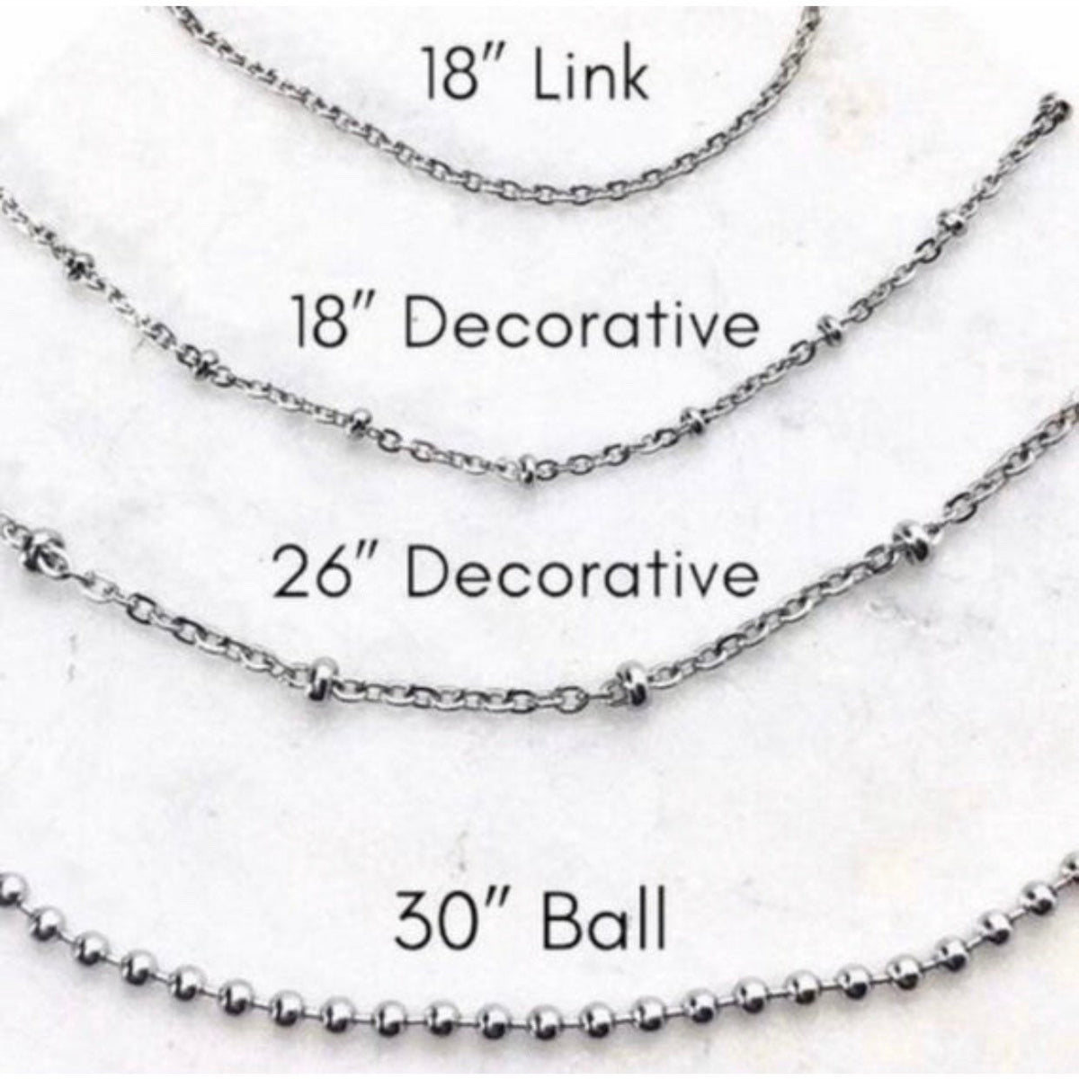 This comes with a stainless steel chain of your choice which you can choose upon checkout. The long, 30β ball chain, can easily be cut down at home with a pair of scissors.