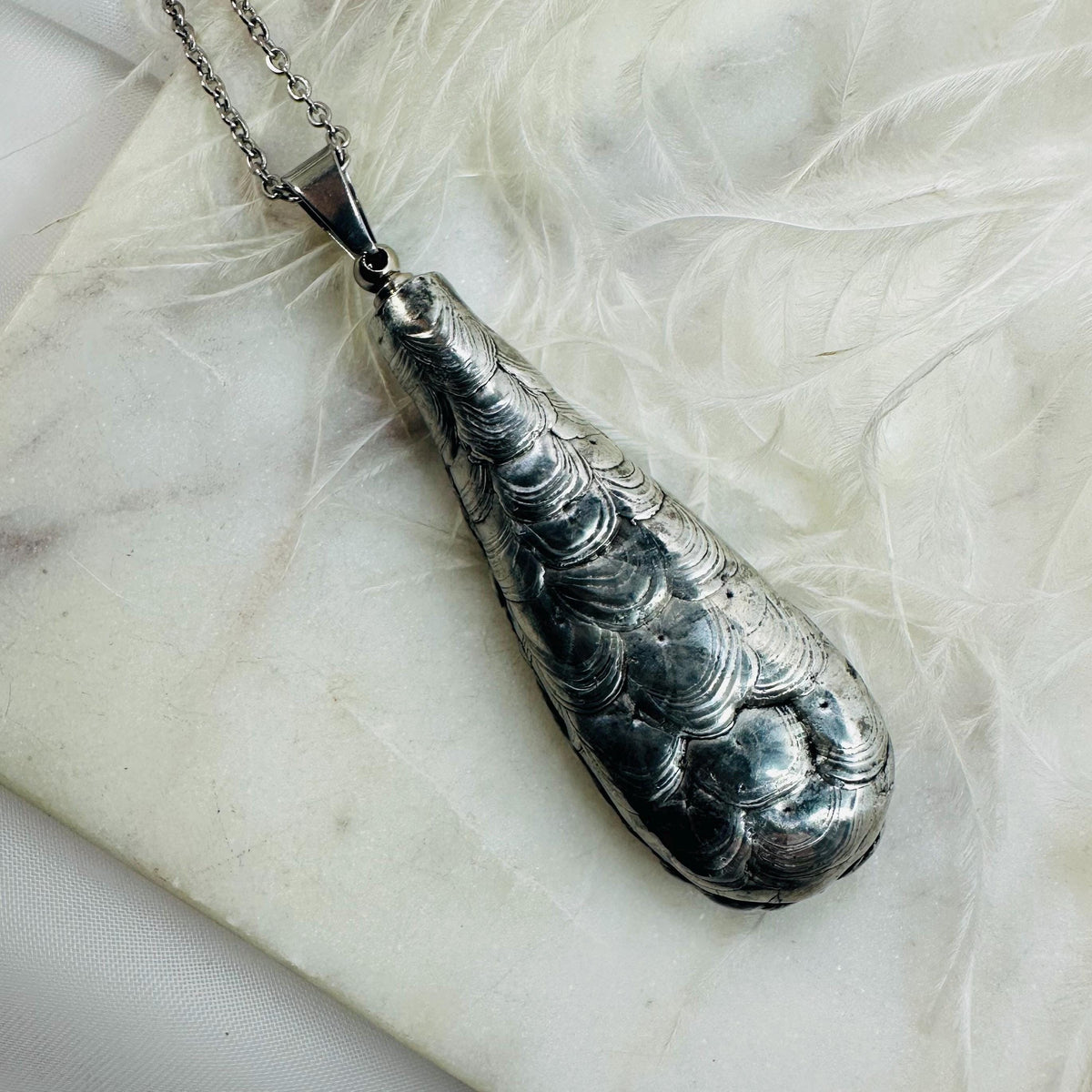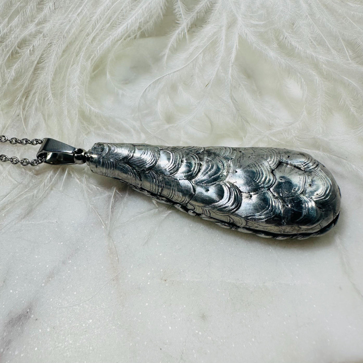 The pendant is made with a silver mixture of tin and copper, melted then dripped, creating natural formations. The metal is then hand painted and oxidized, giving the once bright silver finish, a rustic, aged look.