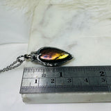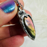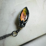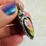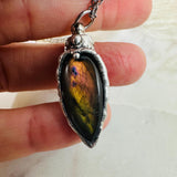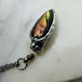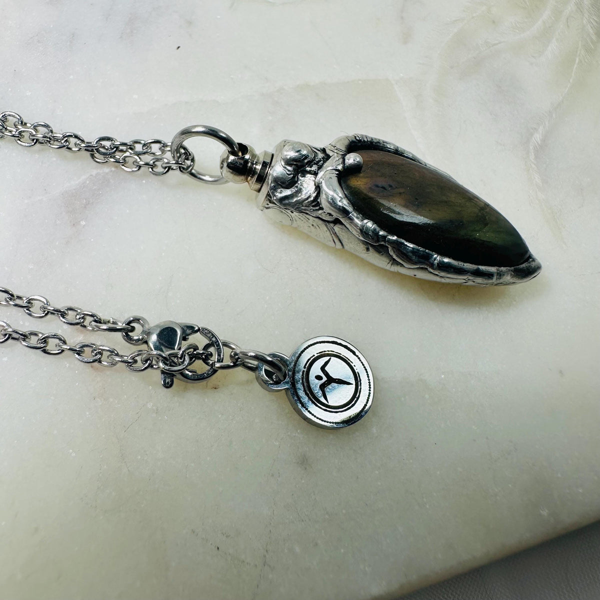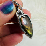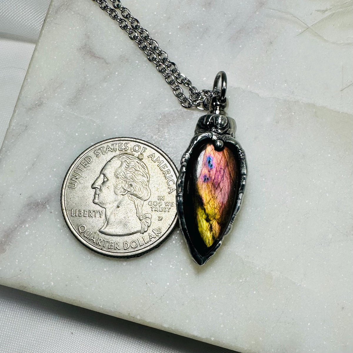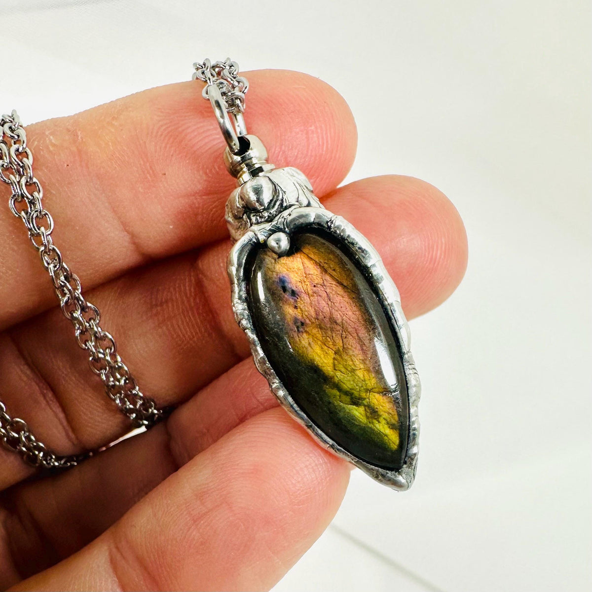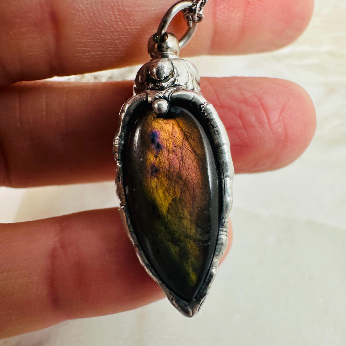 This pendant highlights the natural beauty of labradorite and the artistry of its handmade design. No two stones are ever alike, and each metal marking is unique, giving your necklace its own distinct character and energy.