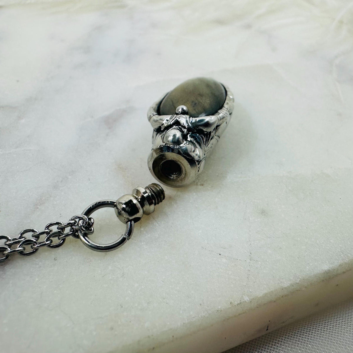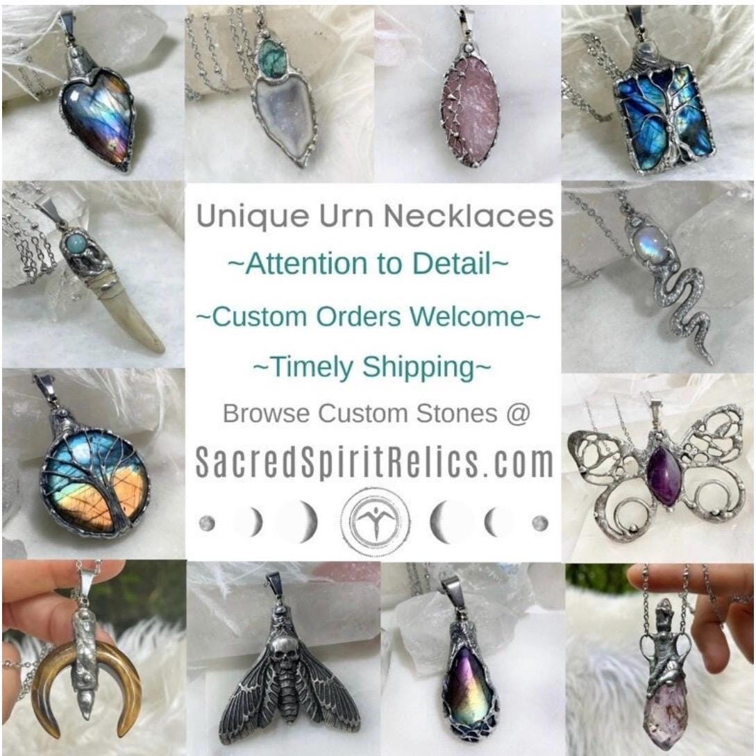 Honor a loved one with this Purple Labradorite Urn Necklace, a handmade piece created to hold a small amount of ashes or another special keepsake close to your heart. Each pendant is crafted by hand, making it a one-of-a-kind memorial that offers both comfort and beauty.