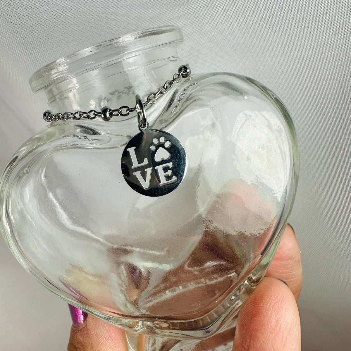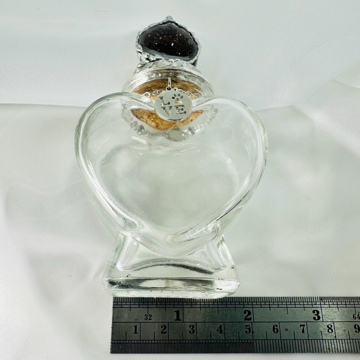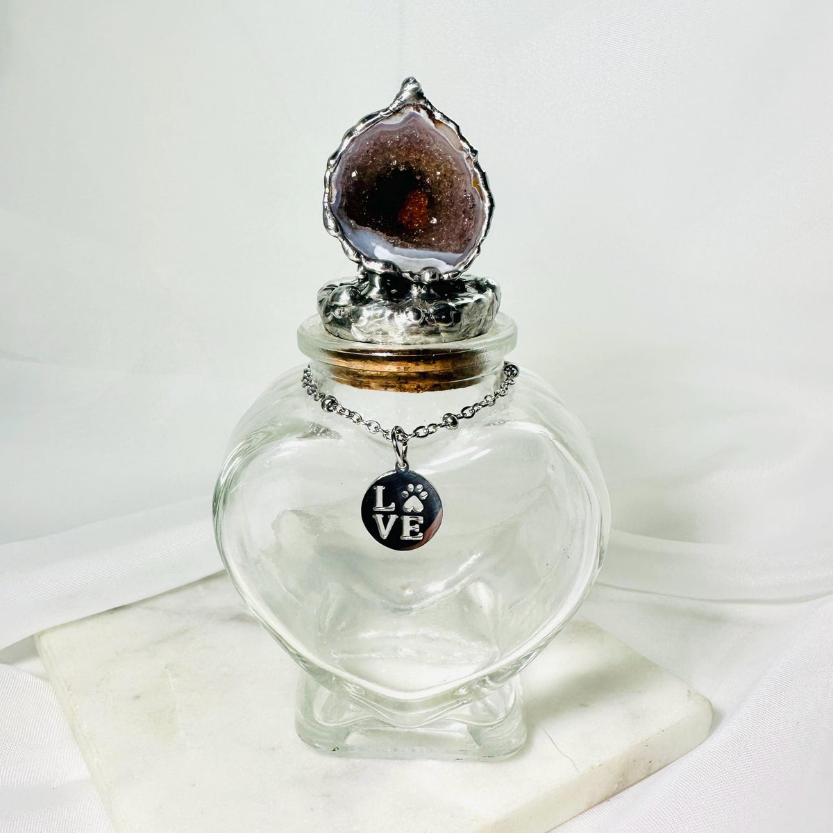This heart-shaped glass keepsake jar is designed to hold a remembrance of your beloved pet. The lid is crowned with a natural geode, soldered to the cork, with a gorgeous sparkle. This is a one-and-only piece. Around the neck hangs a small, stainless steel charm that reads LOVE with a paw print… a gentle reminder of the bond you’ll always share. ❤️🐾🙏🏼