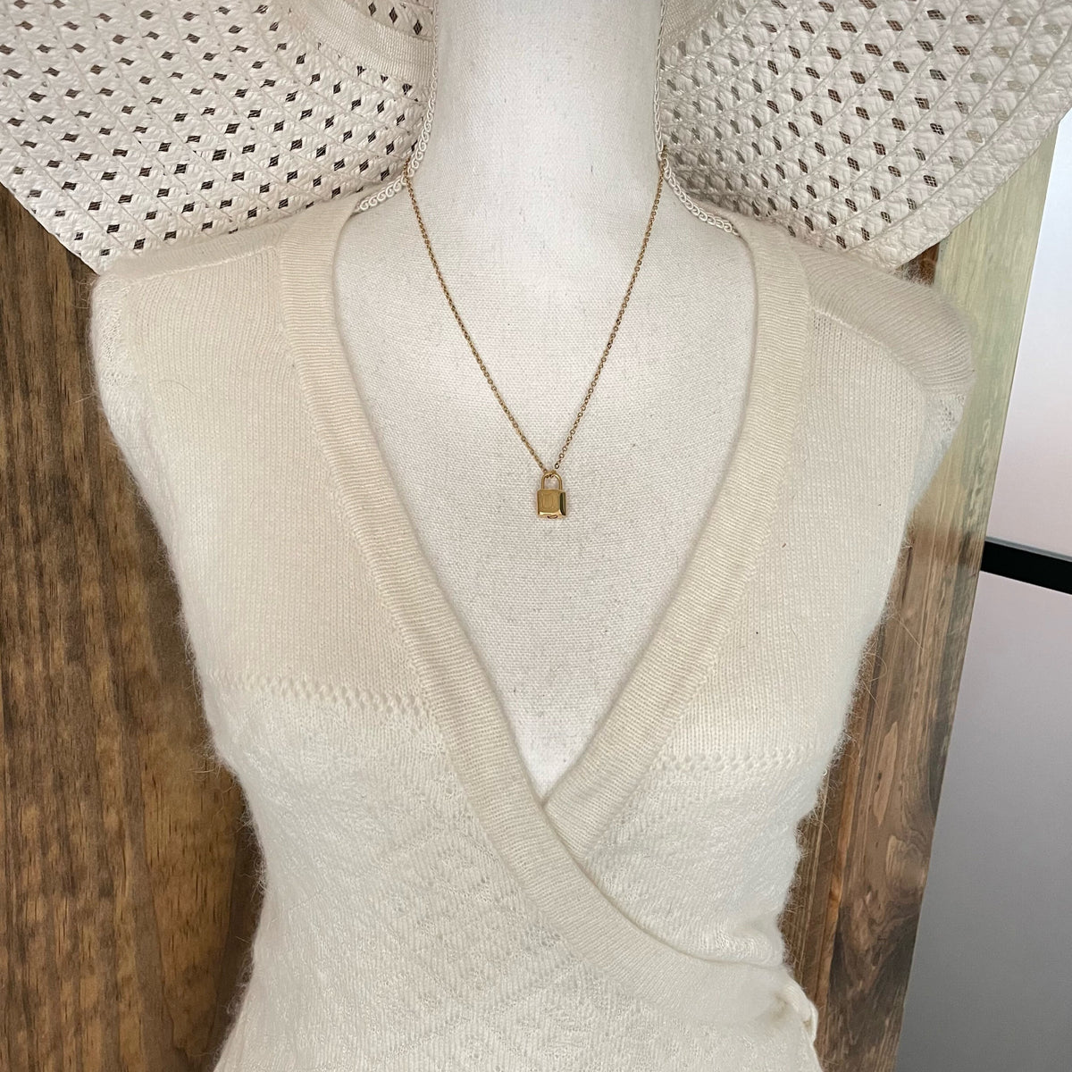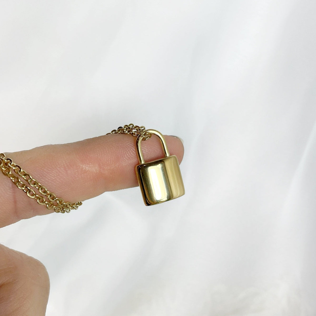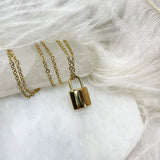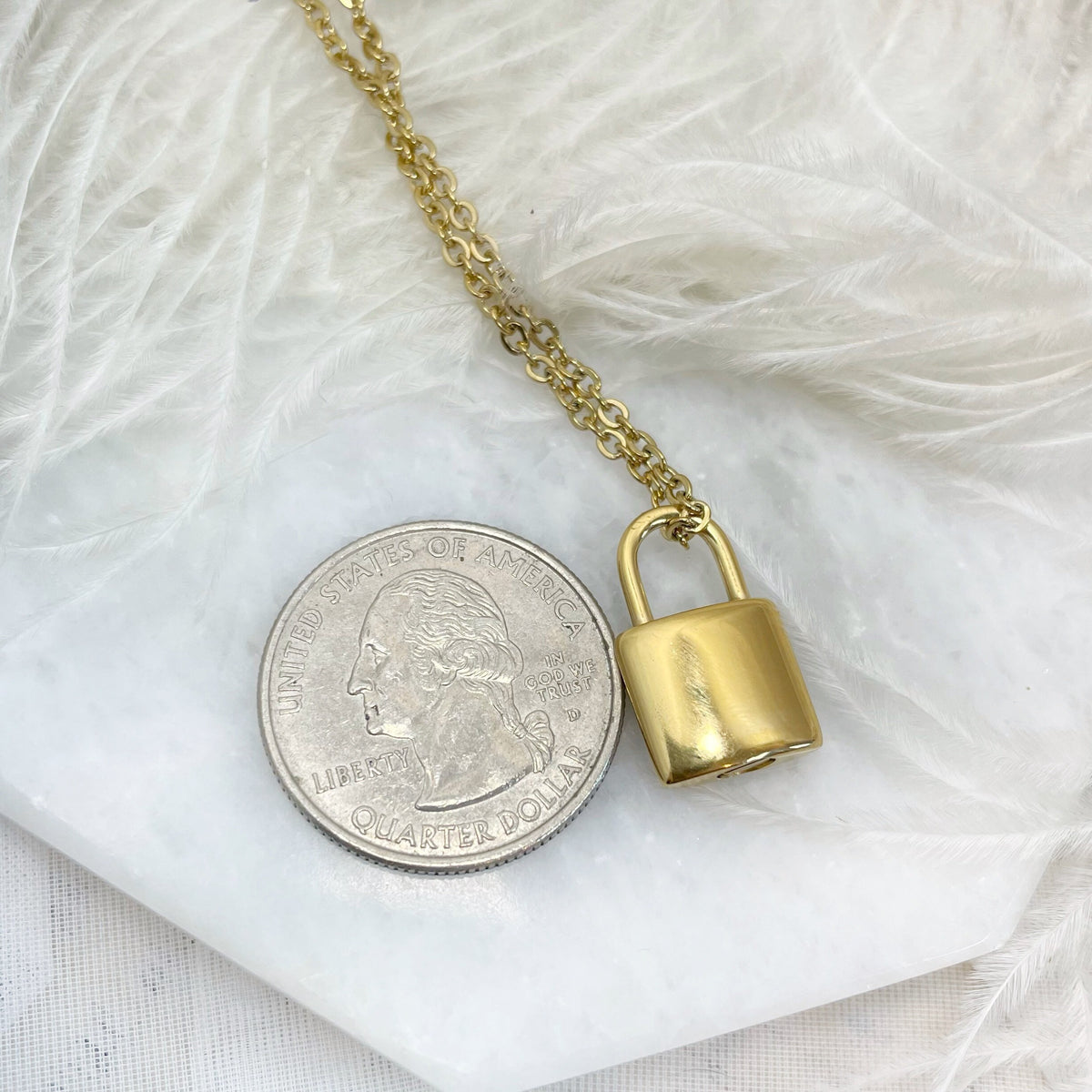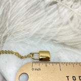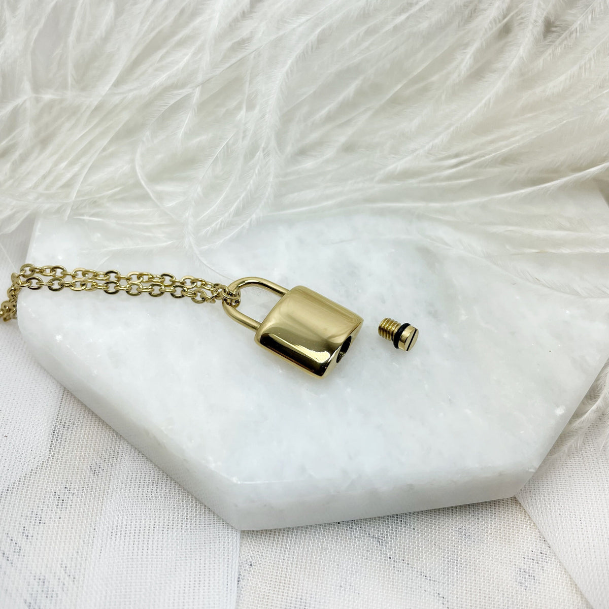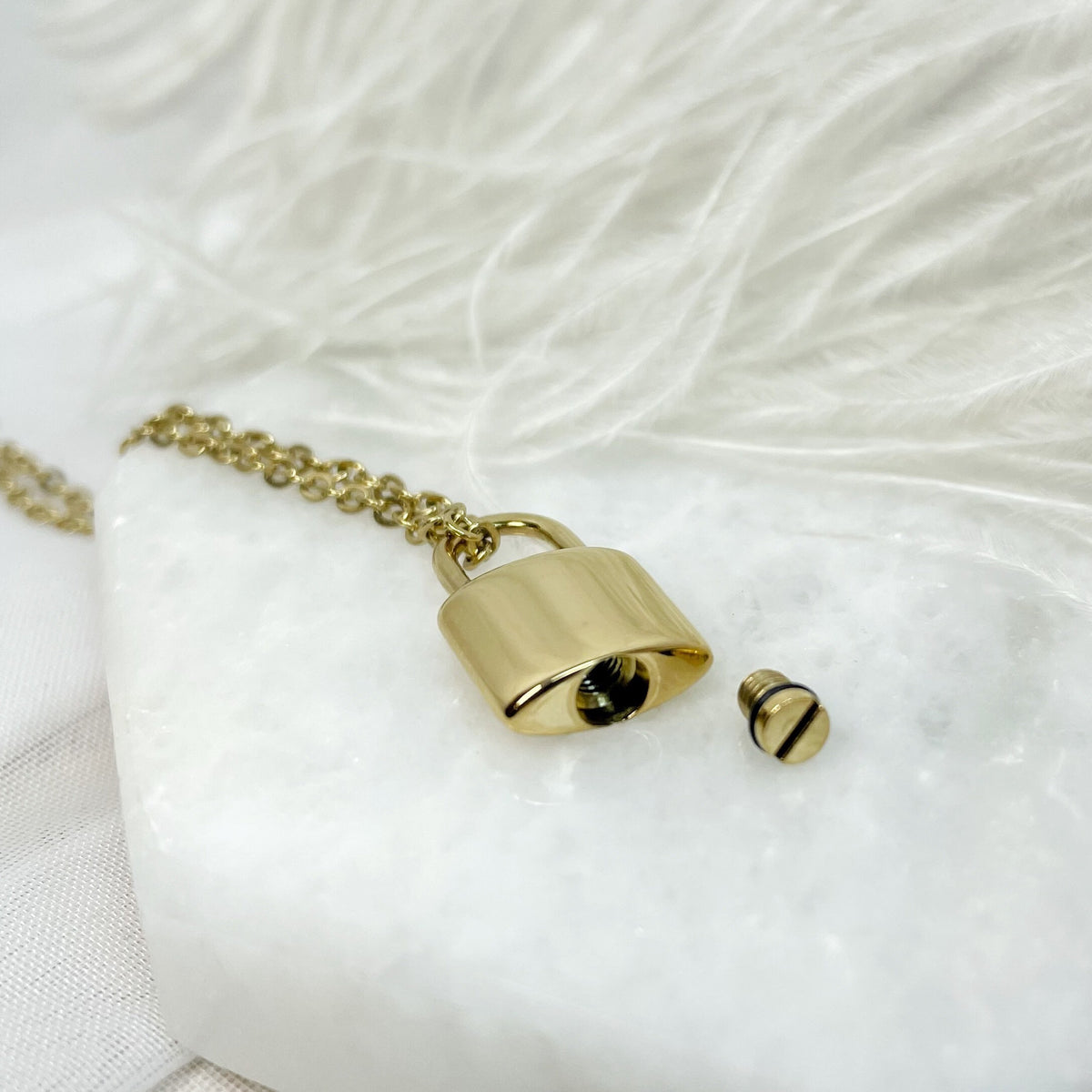A little, gold plated, stainless steel urn necklace. This small padlock cremation urn is great for layering with other necklaces or wearing it simply by itself. It has a small container and will hold just a pinch of ashes.