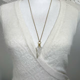 The top part is made of brass and it comes on a 30” gold plated link chain. If you wish for me to shorten it, please leave a note upon checkout with your desired length and I will make the adjustments for you.