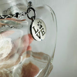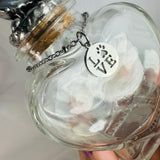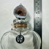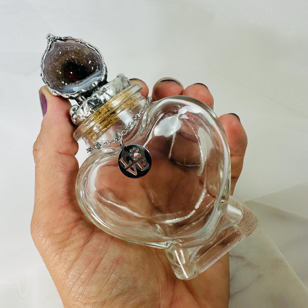 This heart-shaped glass keepsake jar is designed to hold a remembrance of your beloved pet. The lid is crowned with a natural geode, soldered to the cork, with a gorgeous sparkle. This is a one-and-only piece. Around the neck hangs a small, stainless steel charm that reads LOVE with a paw print… a gentle reminder of the bond you’ll always share. ❤️🐾🙏🏼