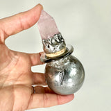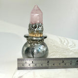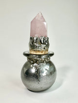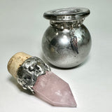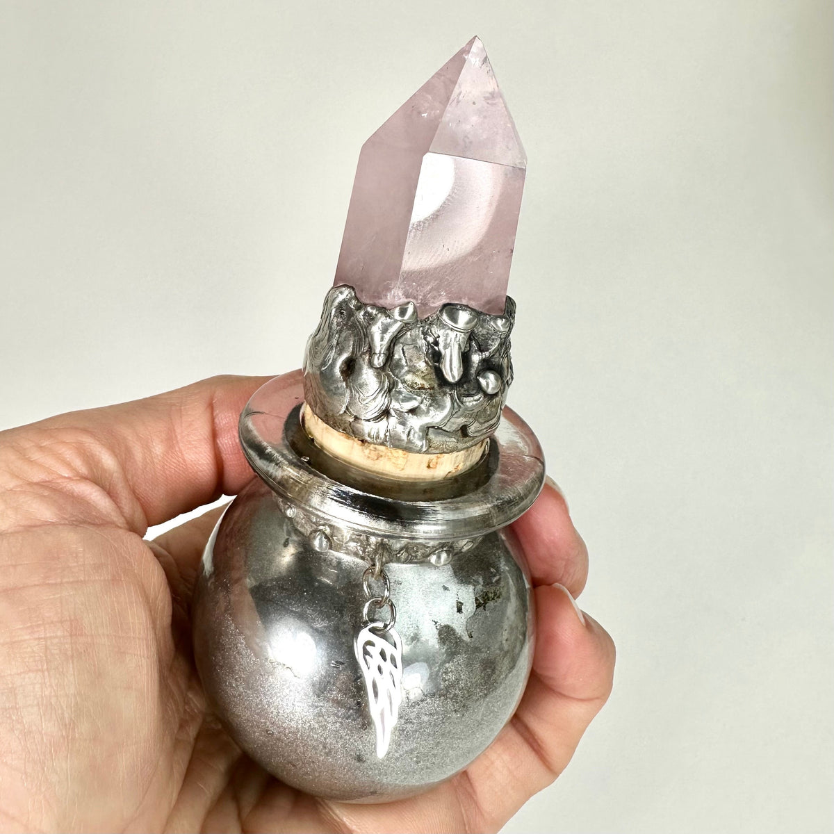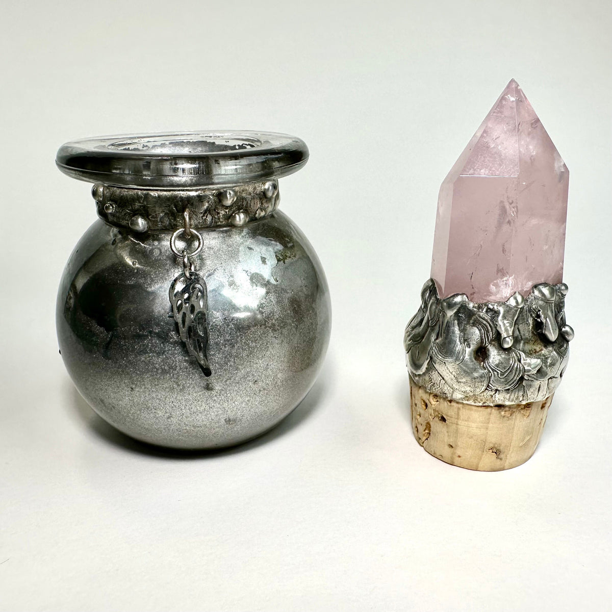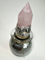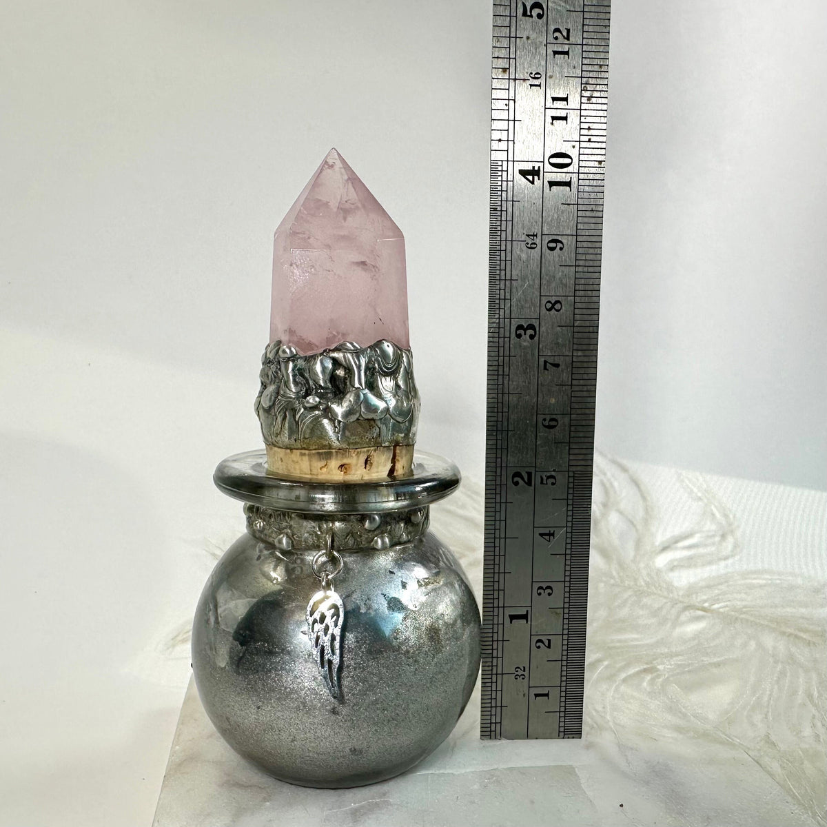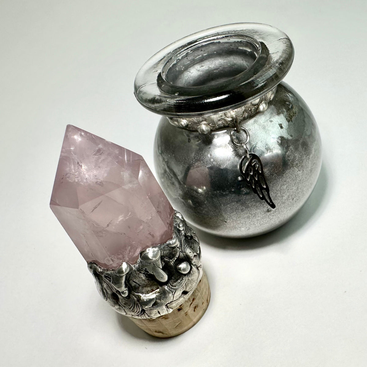 This little urn features a Rose Quartz Point on it’s lid. It has been hand painted silver, on the inside of the glass. ✨ Hanging in front of this little beauty is a small angel wing.