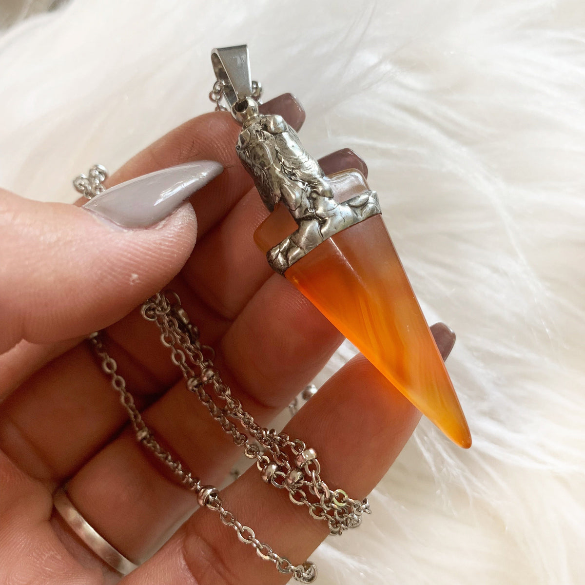 This piece is gorgeous. The agate is a perfect soft orange and has a very bold appearance. I am so grateful that I found something to perfectly represent one of my closest friends! I've been wearing it every day for the past 2 months and it has held up nicely. The packaging is also very cute and heartfelt. Very sweet! Thank you