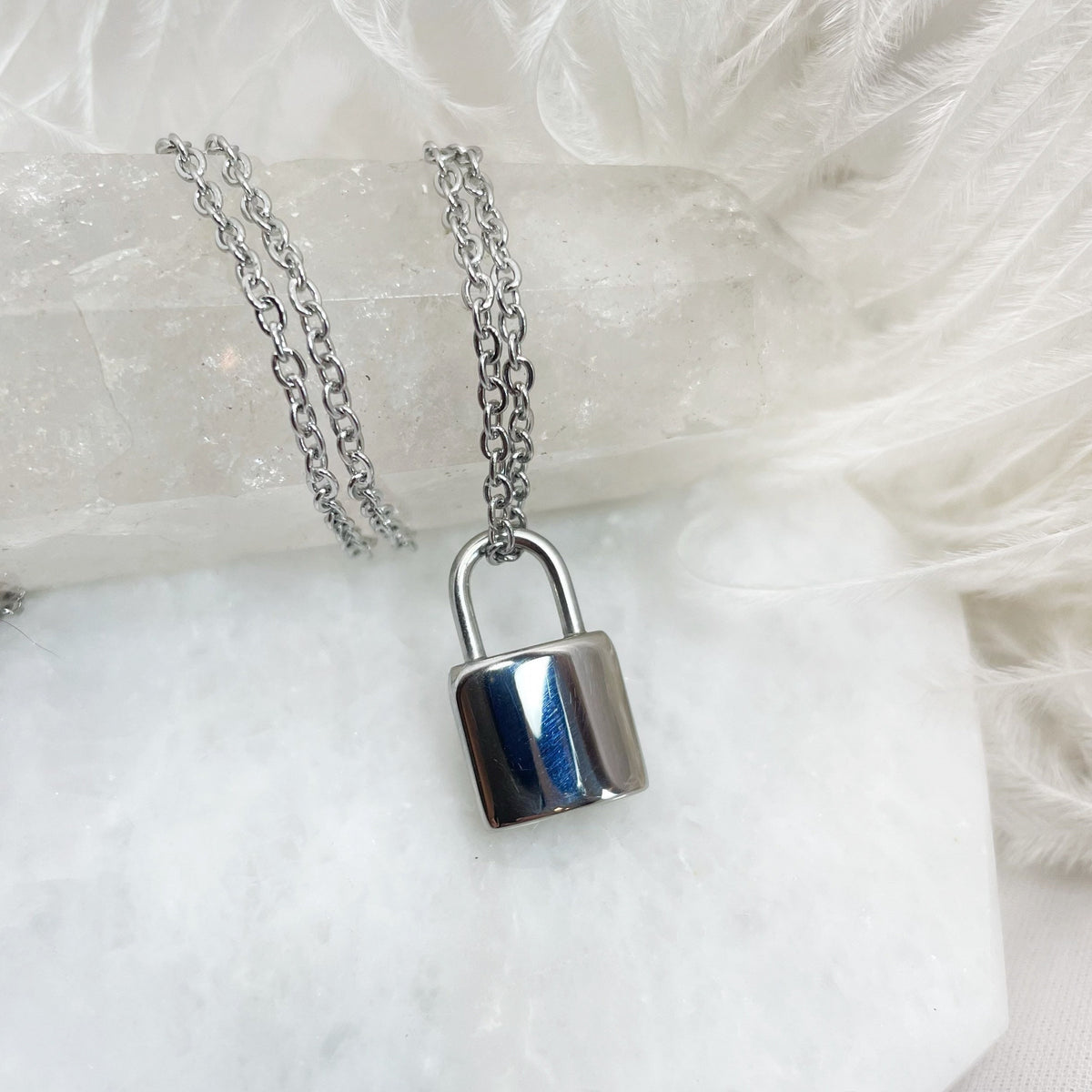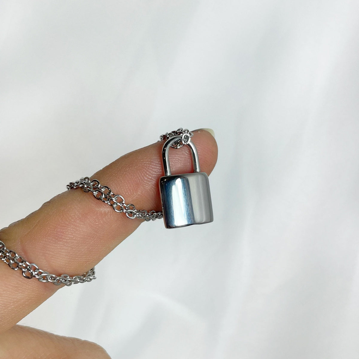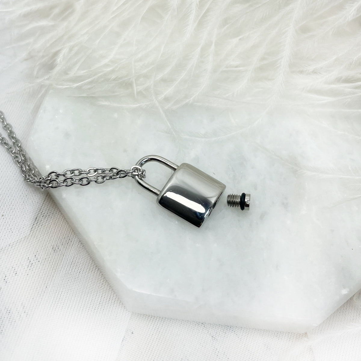 A little, stainless steel urn necklace. This small padlock cremation urn is great for layering with other necklaces or wearing it simply by itself. It has a small container and will hold just a pinch of ashes.