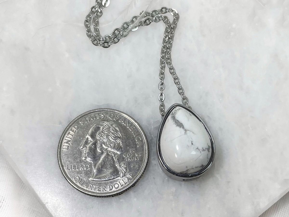 A White Buffalo teardrop urn necklace, lightweight and comfortable for everyday wear. π€ The stone is also known as Howlite.